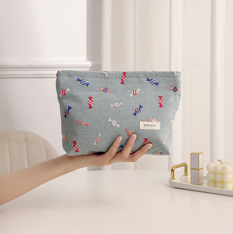 Özel yeni karikatür şeker desen fermuar makyaj çantası tasarım pamuk jakarlı kumaş şeker kozmetik çantası